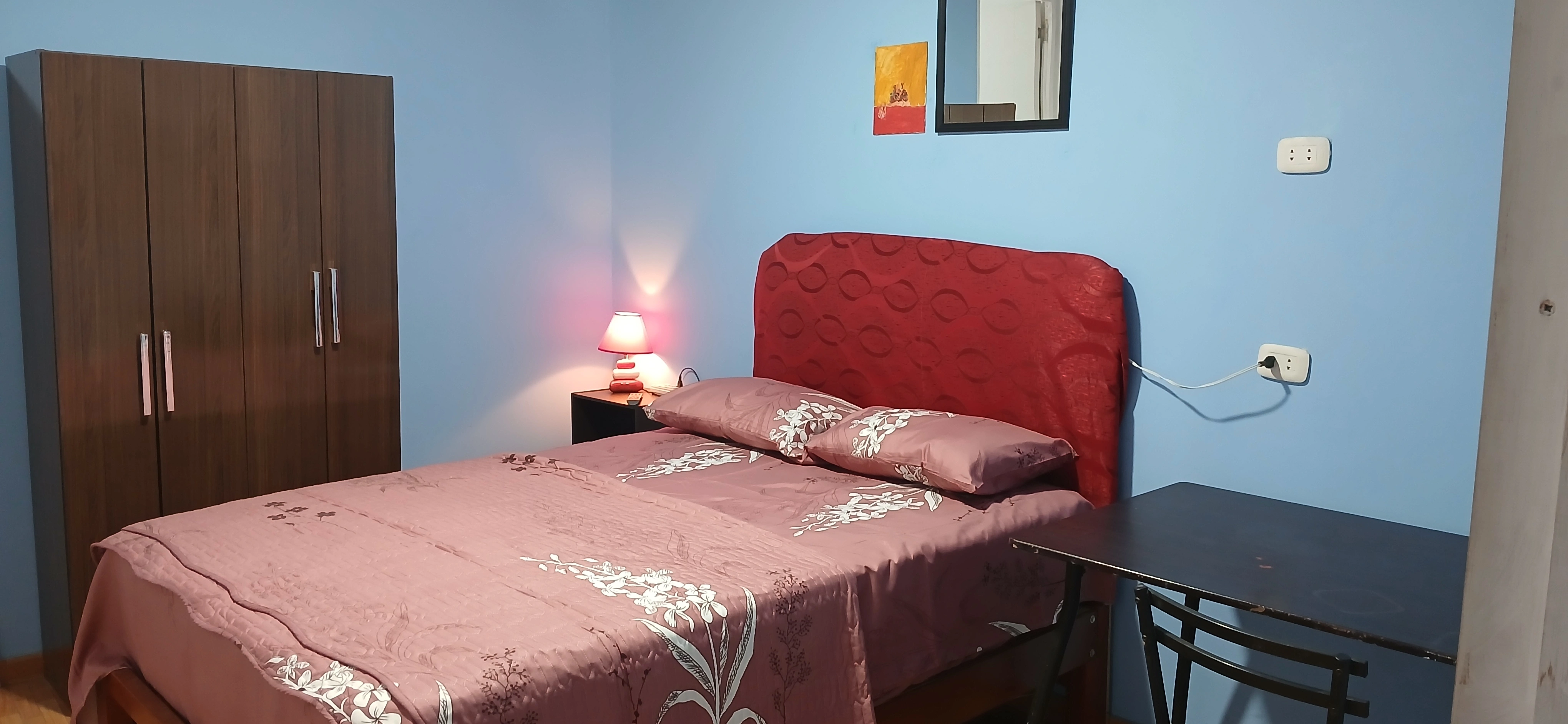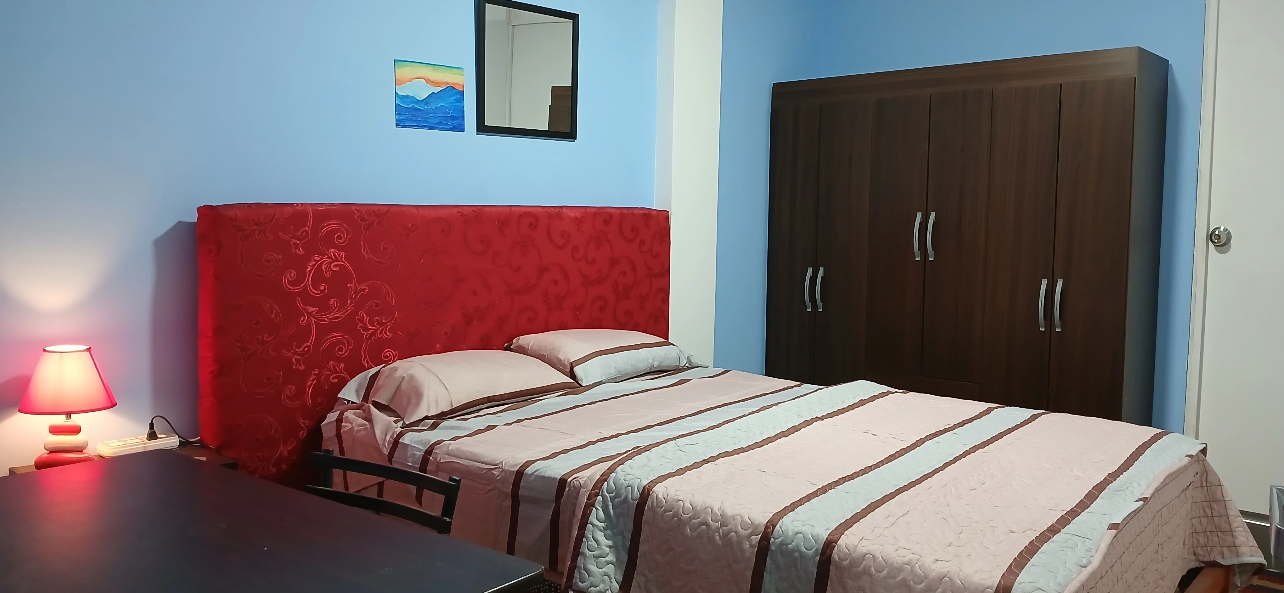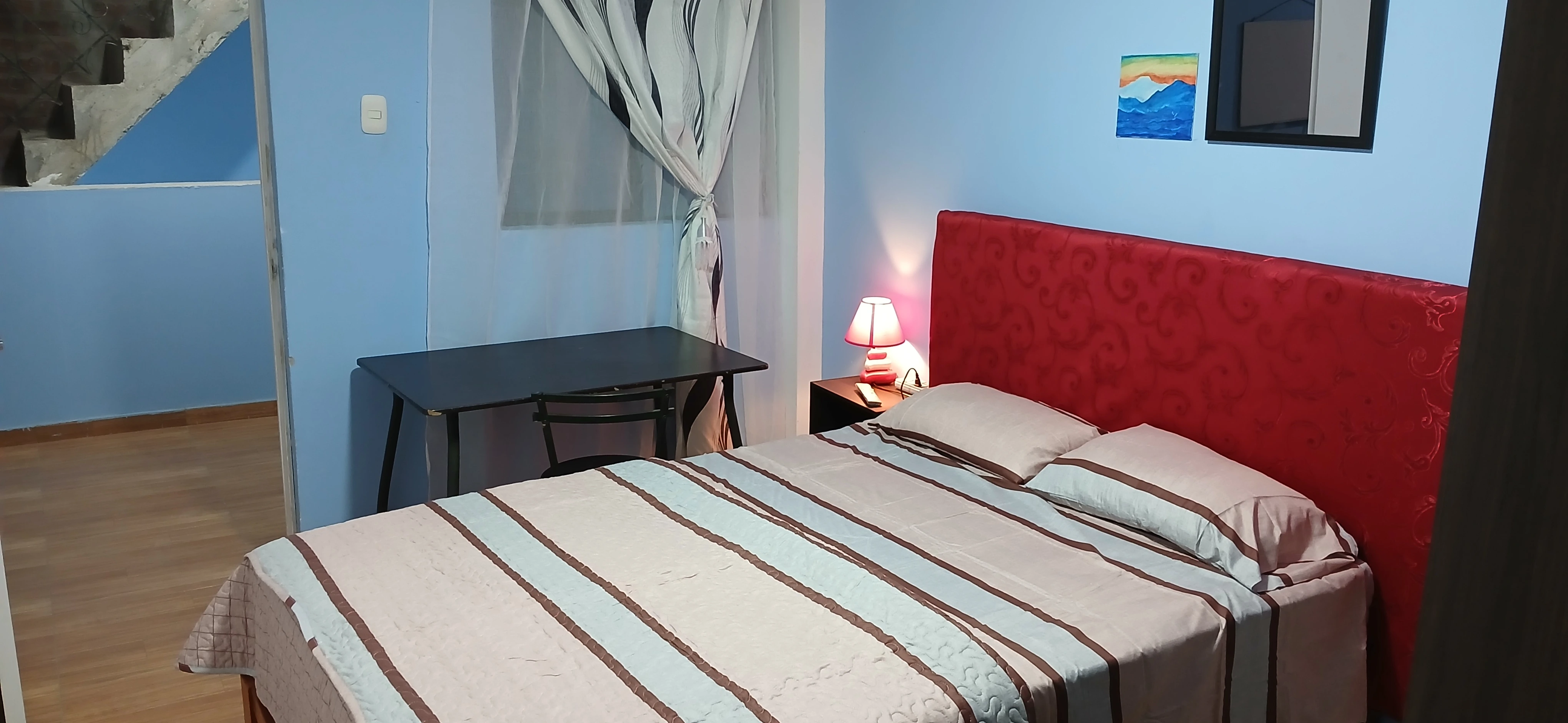 Una habitación tranquila y relajante, ideal para una persona o pareja. Cuenta con una cama de 2 plazas, baño privado, escritorio, ropero y Smart TV con YouTube. Perfecta para descansar cómodamente en el centro de Chulucanas..